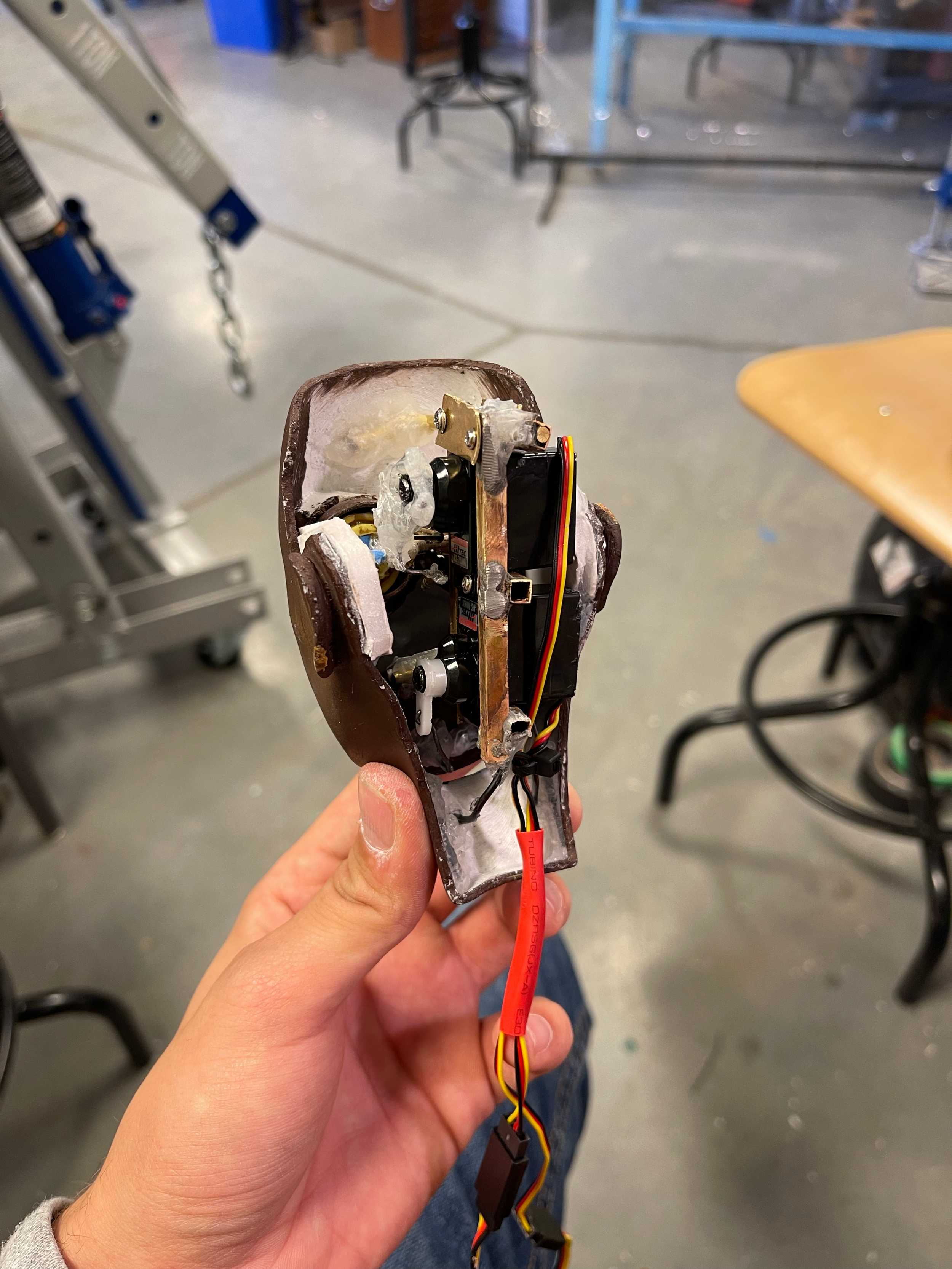 Sammy Without Strings was truly a challenge. The puppet’s head was only 4 ½ inches tall. The heads were 3D printed by Lucas and were then painted by the art department. The head would then come back to Lucas and his team for the installation of eye mechanics and RC servos. All electronics were hidden within the puppet in order to allow the marionette team the flexibility to make him dance across stage.
