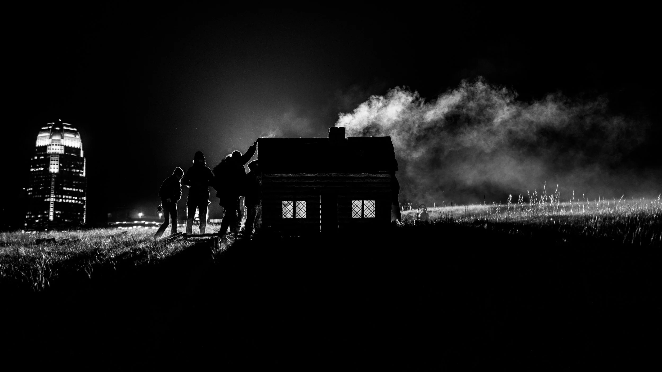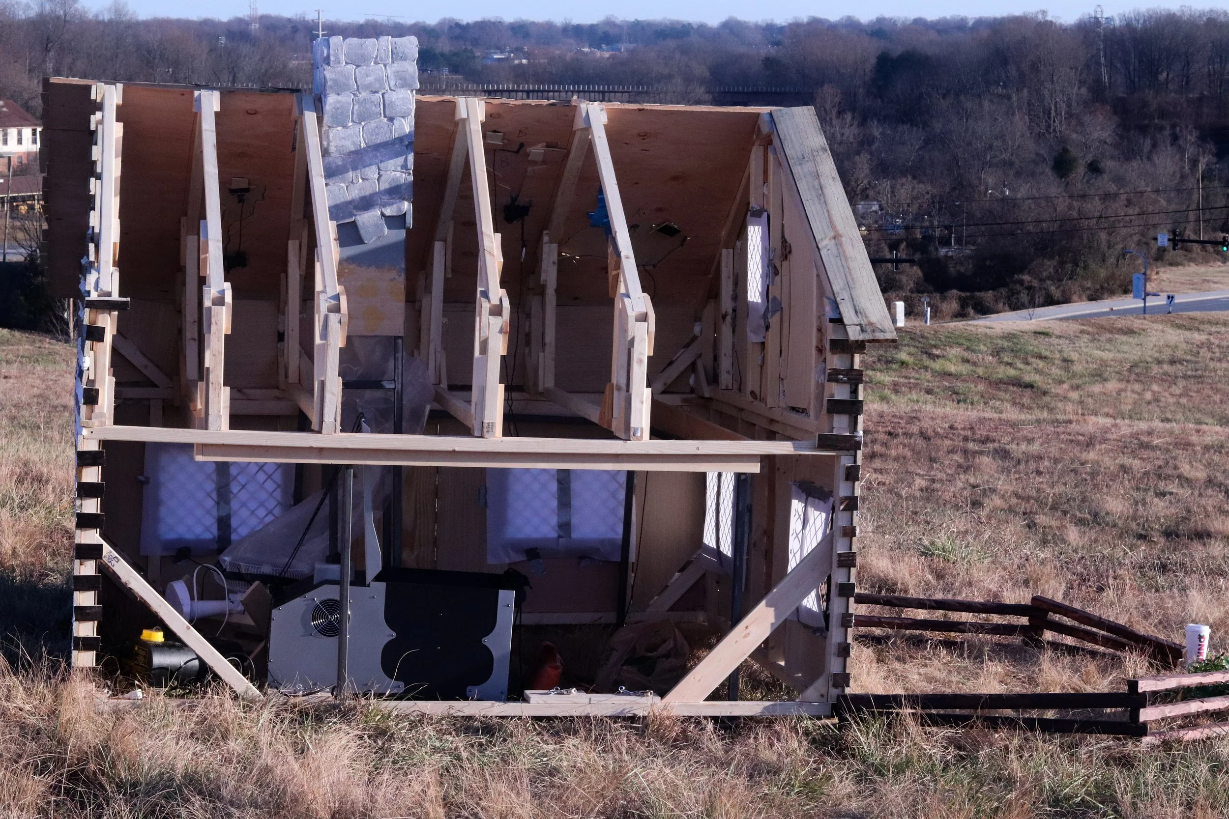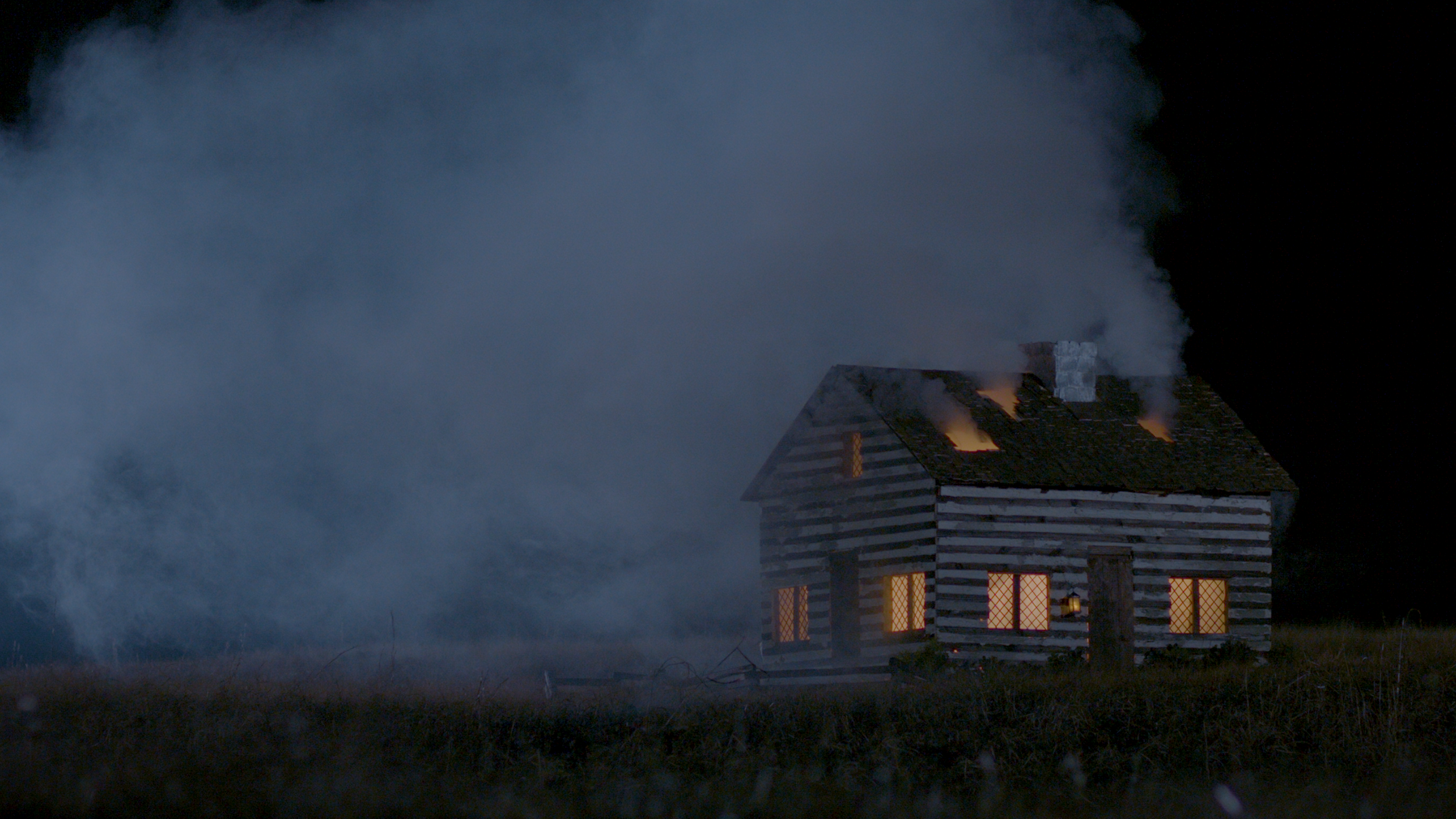 The miniature was primarily built by the art department. Lucas and his team created panels that would be pulled out via pullies from behind. When a panel would fall, shingles would slide down the roof and smoke would roar out of the hole. This would simulate a fire consuming the house from the inside out. After a take, panels and shingles could be reset quickly for another take. Small details such as the glowing lantern and the chimney smoke helped to sell the miniature as a real house.